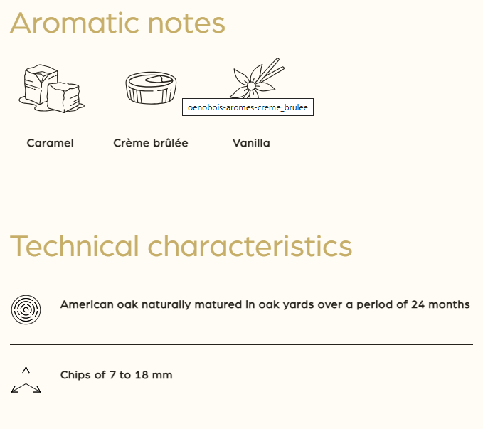 Chips US Médium se perfektně hodí k nedozrálým vínům s cílem zrát ovoce a snížit intenzitu rostlinné složky. Zajímavé dřevo pro práci s termo červenými víny nebo s čerstvými ročníky pro získání na sladkosti a délce chuti.