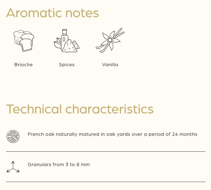 Granulars Fr Medium jsou středně pražená dřeva určená k tomu, aby v nose vynikly atraktivní vanilkové tóny a na patře sladkost.