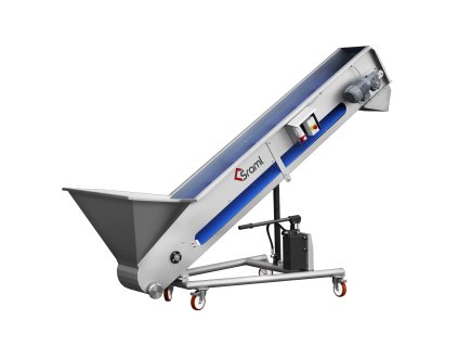 Pro příjem hroznů z kontejnerů, zásobníků nebo návěsů. Pásové dopravníky umožnují kontrolu kvality hroznů a šetrnou dopravu ovoce do určeného zpracovatelského stroje.